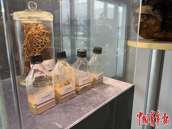 中科优术(黑龙江)科技产业有限公司一楼展厅,陈列出该公司研发的松茸提取物、白灵菇提取物等产品。中青报·中青网见习记者 杨雷/摄