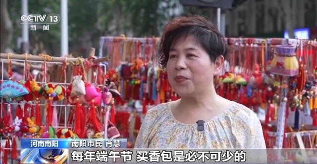 除了粽子,很多地方还有选购香包的习俗。在河南南阳,琳琅满目、寓意健康吉祥的手工香包受到消费者的喜爱。