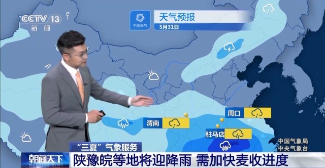 中国气象局气象分析师 胡啸:目前夏收工作已经进入到核心时段,我们常说,春争日夏争时,这是一个与时间赛跑的大忙时节。通常条件之下,在夏初的时候,我们期待晴朗少雨和风小的天气,有利于冬小麦的收获和晾晒。