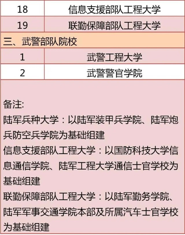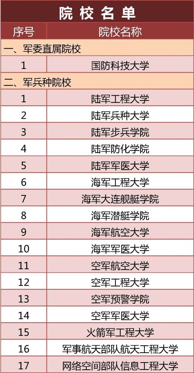 央视网消息:据首都教育微信公众号消息,今年,共有22所军队高等教育院校面向普通高中毕业生招生。其中,军委直属院校1所,军兵种院校19所,武警部队院校2所。