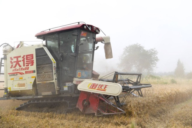 5月27日,在河南省信阳市淮滨县马集镇,履带式收割机在麦田作业收获弱筋小麦。新华社记者 郝源 摄