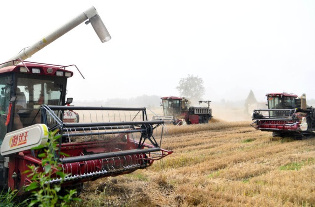 新华社郑州5月29日电(记者马意翀)在位于河南省信阳市淮滨县马集镇的麦田中,农机轰鸣,随着数十台履带式收割机来回穿梭,成片的弱筋小麦被快速收割、脱粒,饱满的麦粒如瀑布般倾泻进运输车辆……眼下,农业大省河南麦收工作如火如荼,麦田抢收正在“与时间赛跑”。