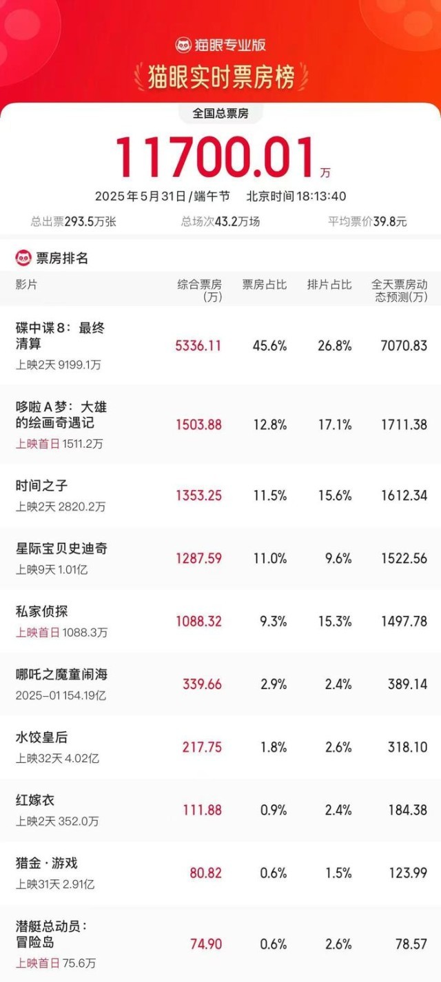 央视网消息:据网络平台数据显示,截至5月31日18时13分,2025年端午节票房超1.17亿,超越2024年端午节当日票房成绩。《碟中谍8:最终清算》暂列端午节首日票房冠军。