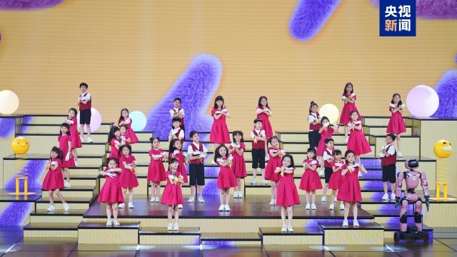 晚会同名主题曲《未来花正开》由来自北京、江苏、陕西、青海、河南、广东等省市及澳门特别行政区的多位少年儿童共同作词、AI作曲,呈现百花竞放的欢腾景象。《秒回童年》通过人工智能技术,请91岁表演艺术家陶玉玲、张勇手与童年时期的自己惊喜“同框”,展现时光流转中不变的艺术初心与传承力量。《抱抱地球》中立方体升降屏上生动呈现出一只“会唱歌的裸眼3D大熊猫”,它与小朋友共唱自然之歌,传递对地球的关爱。