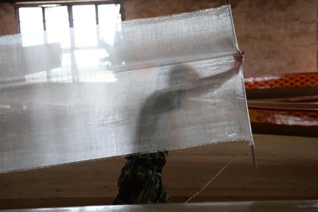 ↑汨罗市屈子祠镇九子龙屈原龙舟厂内,一名工人正在准备制作龙舟用的玻璃纤维布。新华社记者 陈振海 摄