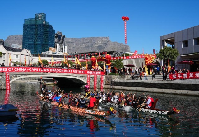 ↑2025年5月24日,人们在南非开普敦参加第三届“文化中国·开普敦龙舟节”的1500米龙舟竞速赛。新华社记者 王雷 摄