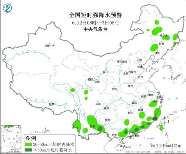 预计6月2日8时至3日8时,东北地区中西部、华北东北部、江南东北部、华南中北部等地的部分地区将有8级以上雷暴大风或冰雹天气,其中,黑龙江西南部、吉林西北部、辽宁中西部等地的部分地区将有10级以上雷暴大风,最大风力可达11级以上,辽宁中西部等地局地不排除出现龙卷的可能性;东北地区中北部、江南中东部、华南中东部、西北地区南部、西南地区北部和南部等地的部分地区将有小时雨量大于20毫米的短时强降水天气,其中,福建东部和南部、云南东南部、广东中南部等地的部分地区小时雨量大于50毫米。