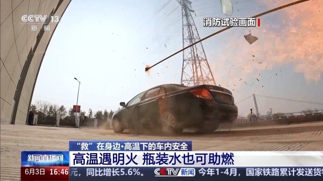 消防员进行了模拟试验,在车外用明火模拟高温环境下引燃除臭剂的情况,可以看到遇到明火后瞬间被引燃。消防员提示,这些气体如果扩散到一个有限的空间里面,很容易形成爆炸性混合气体,发生爆燃的情况,所以高温环境下一定不要将这类物品留在车内。那炎热的高温下,我们在车内饮水再正常不过了,瓶装水随手放置在车内,又会发生什么样的情况呢?