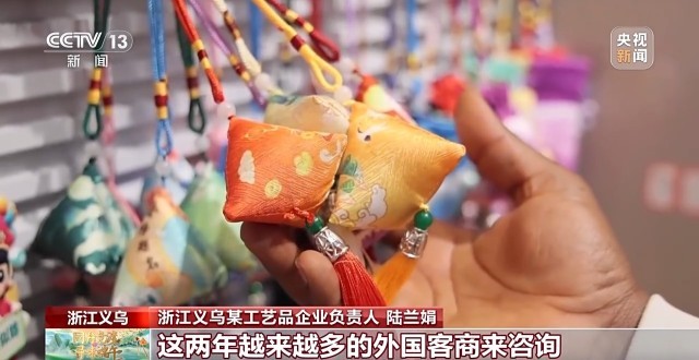 浙江义乌某工艺品企业负责人 陆兰娟:以前香囊的消费群体以国内为主,这两年,越来越多的外国客商来咨询。前年卖出了15万个左右,去年订单翻了一番,有30万个。那今年的订单也明显超过了过去,尤其是新加坡、马来西亚、越南这些地区的客商明显增多。