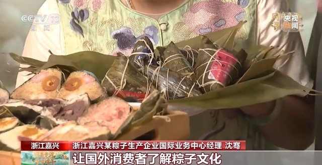 浙江嘉兴某粽子生产企业国际业务中心经理 沈骞:我们在直播中会展示粽子制作过程、食品溯源以及科普习俗,让国外消费者了解粽子文化。我们还积极参加一些国内外的展会,结合当地文化和消费习惯,对产品进行本土化改进,促进消费。今年,我们的粽子出口到了柬埔寨的商超和网购平台,在韩国大枣粽和豆沙粽非常受欢迎。