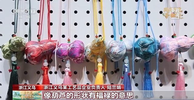 义乌某工艺品企业负责人 陆兰娟:今年,在香囊的外观设计上面,我们结合了中国传统节日祝福的元素,设计了立体葫芦、柿子等款式。像葫芦的形状有福禄的意思;柿子有事事如意的寓意,都是今年的“爆款”。