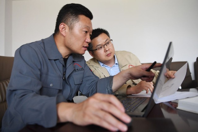 麦积山石窟艺术研究所副所长张铭(左)和同事修改完善《麦积山石窟考古报告》。新华社记者 陈斌 摄
