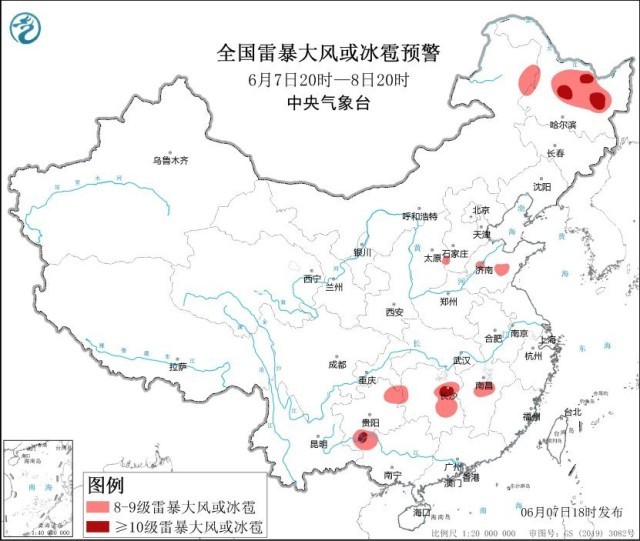 中央气象台6月7日18时继续发布强对流天气蓝色预警