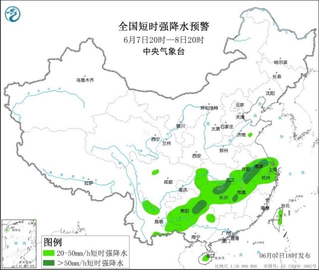 预计,6月7日20时至8日20时,江苏南部、安徽南部、上海、浙江北部和西部、江西北部、湖北东南部、湖南北部、贵州中南部、广西西北部等地部分地区有大到暴雨,其中,安徽南部、湖北东南部、江西北部、浙江西北部、湖南东北部等地部分地区有大暴雨(100~180毫米)。
