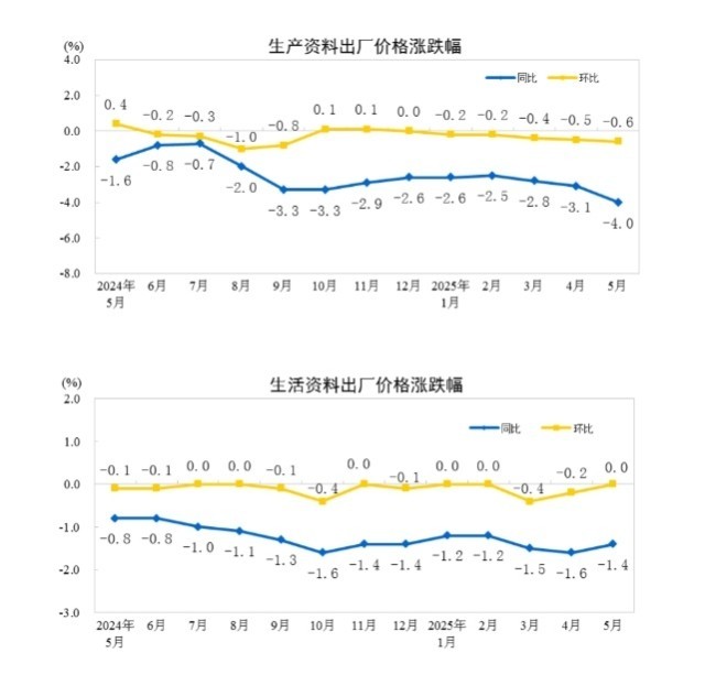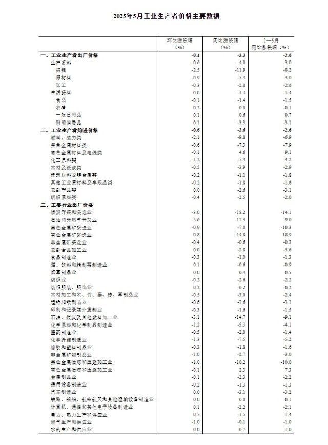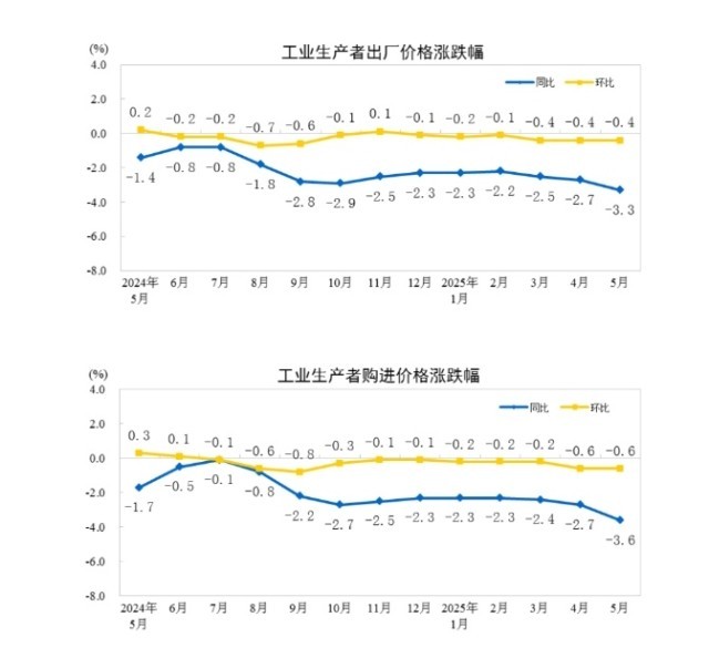 2025年5月份,全国工业生产者出厂价格同比下降3.3%,环比下降0.4%;工业生产者购进价格同比下降3.6%,环比下降0.6%。1—5月平均,工业生产者出厂价格和购进价格比上年同期均下降2.6%。