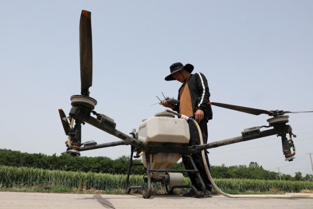 2025年5月7日,在河南省焦作市温县祥云镇古贤村,村民为植保无人机添加药液开展“一喷三防”。新华社发(徐宏星摄)