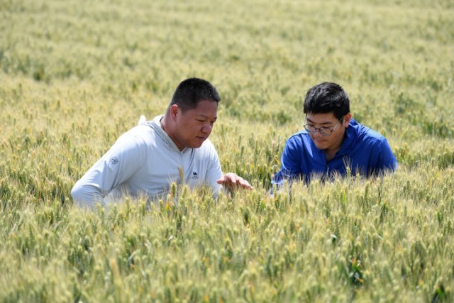 贾俊杰(左)和农业技术员在山西运城永济市虞乡镇麦田里查看小麦生长情况(2025年5月21日摄)。新华社发(薛俊摄)