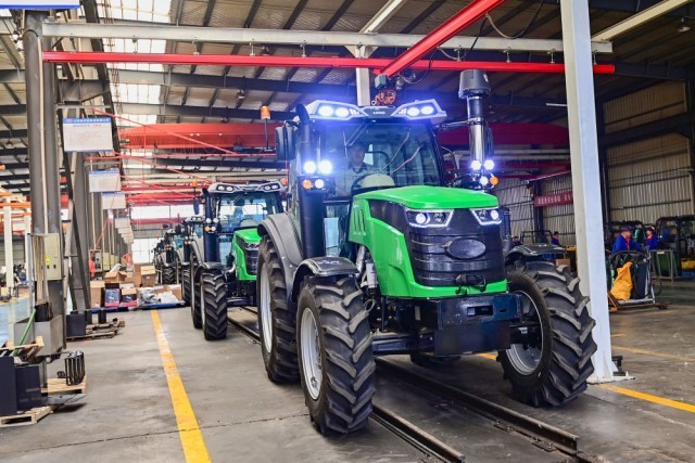 5月15日,在山东省青州经济开发区一家大型农机制造企业,工人调试检验出口海外的大马力拖拉机。新华社发(王继林 摄)
