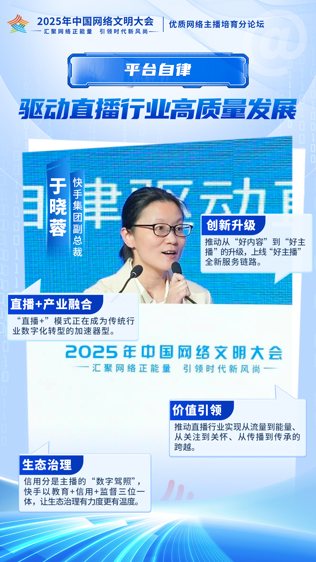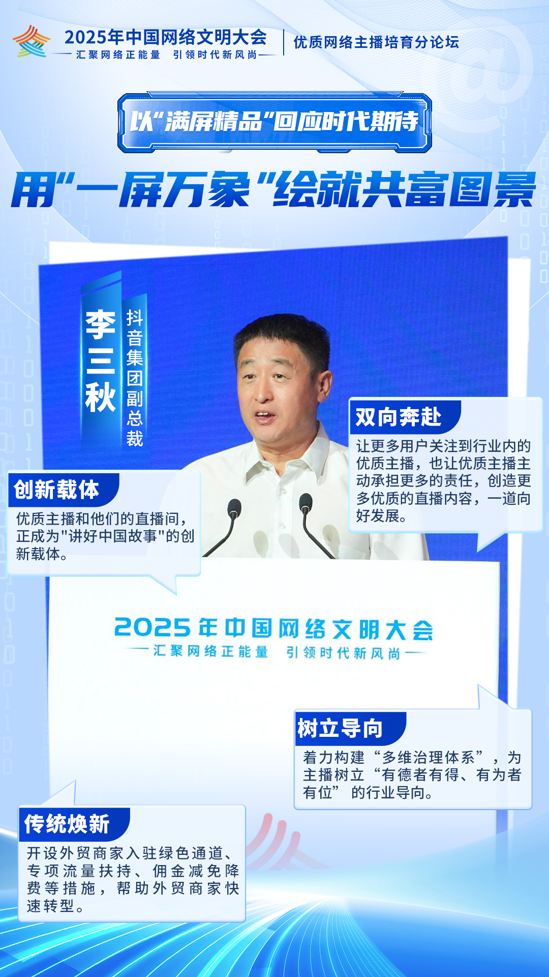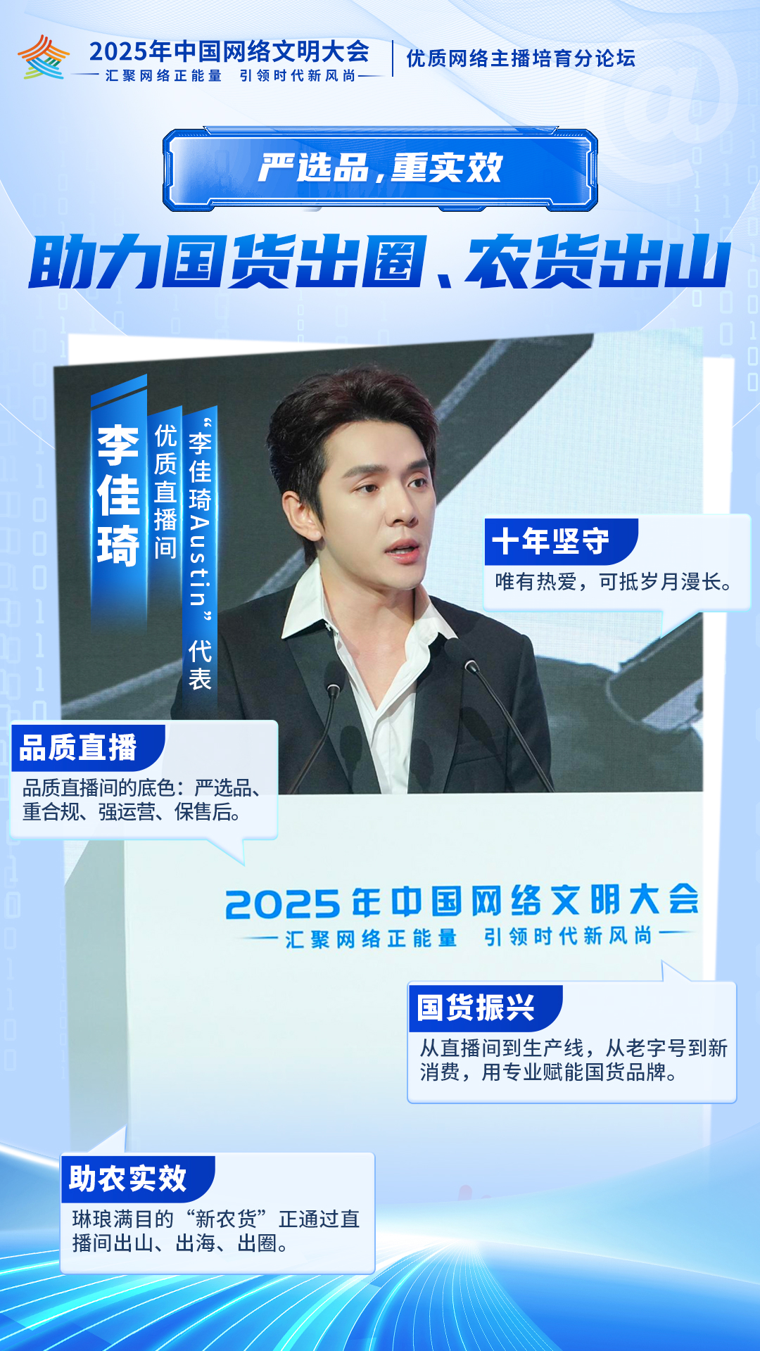6月10日,2025年中国网络文明大会优质网络主播培育分论坛在安徽合肥举办。在论坛的主播分享和主题演讲环节,优质直播间“李佳琦Austin”代表李佳琦强调“品质直播”与“国货振兴”,优质直播间“与辉同行”代表董宇辉倡导“知识传递”与“三农实践”,优质主播代表杨雪蕾则聚焦“内容专业性”与“主播责任”,诠释用专业回馈用户的职业坚守。抖音集团、快手集团、阿里巴巴集团等网络直播平台负责人则分享了“满屏精品”“流量向善”“生态治理”等平台治理理念与具体举措,无忧传媒集团负责人提出主播培育的“无忧模式”,共同探讨强化主播社会责任、推动行业规范发展、弘扬网络正能量的实践路径。