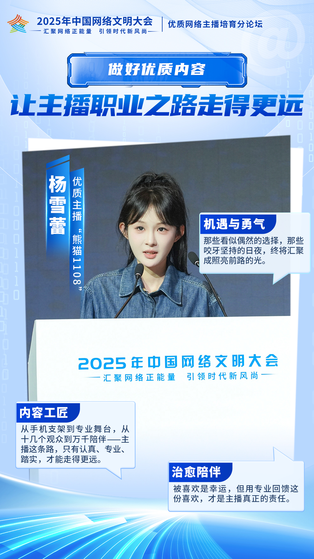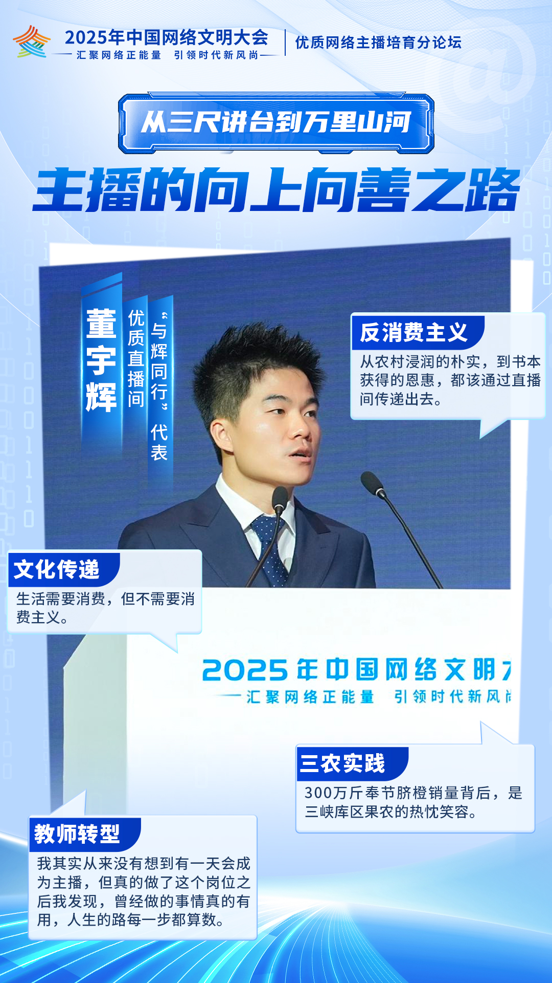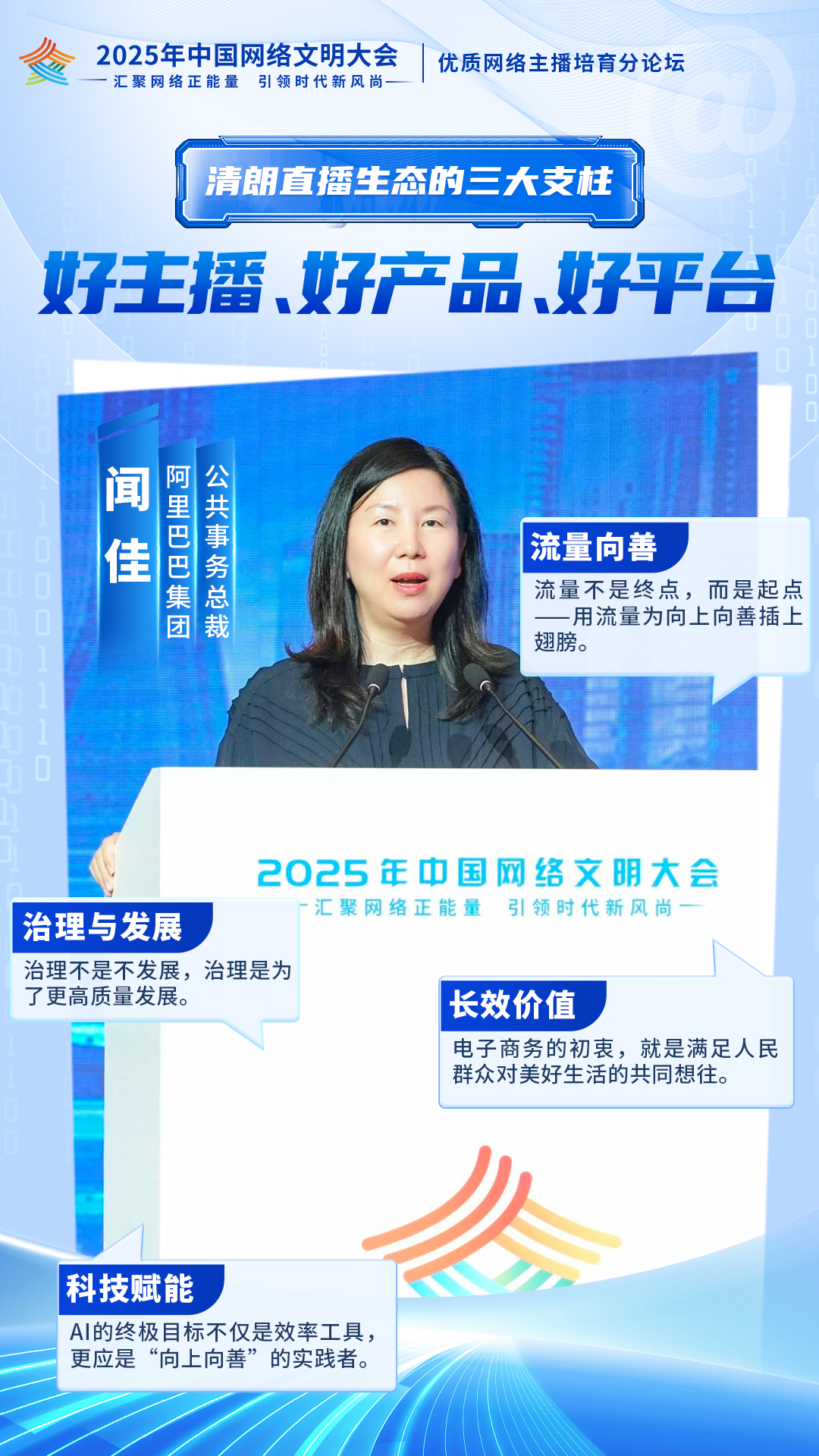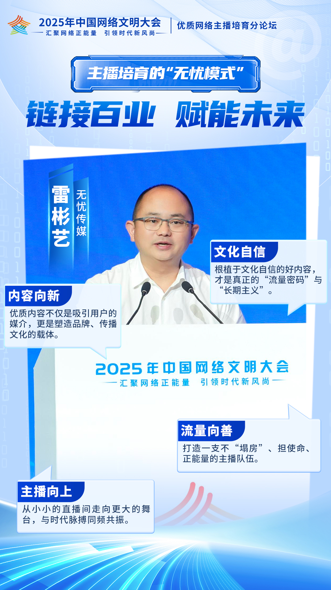 6月10日,2025年中国网络文明大会优质网络主播培育分论坛在安徽合肥举办。在论坛的主播分享和主题演讲环节,优质直播间“李佳琦Austin”代表李佳琦强调“品质直播”与“国货振兴”,优质直播间“与辉同行”代表董宇辉倡导“知识传递”与“三农实践”,优质主播代表杨雪蕾则聚焦“内容专业性”与“主播责任”,诠释用专业回馈用户的职业坚守。抖音集团、快手集团、阿里巴巴集团等网络直播平台负责人则分享了“满屏精品”“流量向善”“生态治理”等平台治理理念与具体举措,无忧传媒集团负责人提出主播培育的“无忧模式”,共同探讨强化主播社会责任、推动行业规范发展、弘扬网络正能量的实践路径。