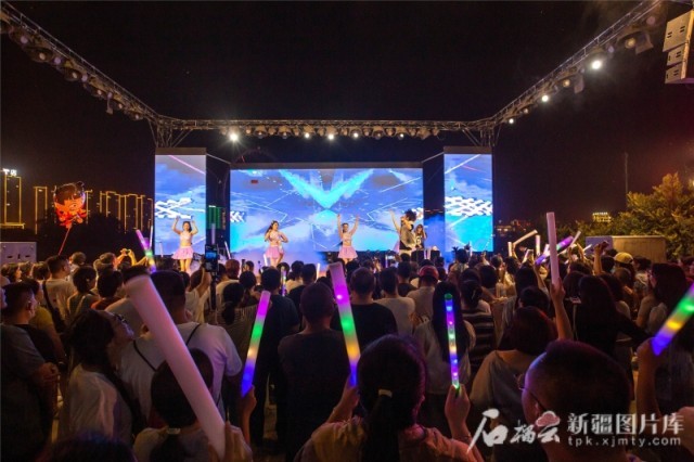 5月31日,游客在库车市城南街道南湖夜市音乐节观看演出。袁欢欢摄