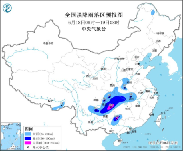 其中,预计,6月18日08时至19日08时,四川东北部和南部、重庆大部、贵州北部、湖南北部、湖北大部、河南中西部、陕西东南部及广西东北部等地部分地区有大到暴雨,其中,重庆东南部、贵州东北部、广西东北部等地部分地区有大暴雨(100~180毫米)。上述部分地区伴有短时强降水(最大小时降雨量20~50毫米,局地可超过80毫米),局地有雷暴大风等强对流天气。中央气象台6月18日06时发布暴雨黄色预警。