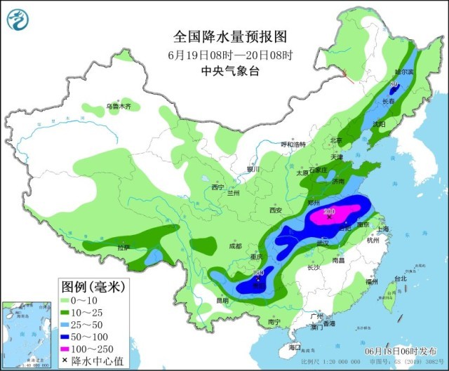 6月19日08时至20日08时,东北地区中东部、西藏东部、华北南部、黄淮、江淮大部、江汉、西南地区东部、广西北部等地部分地区有中到大雨,其中,吉林中部、河南东部、安徽中北部、江苏中北部、湖北、湖南西部、重庆东北部、贵州西南部和中部等地部分地区有暴雨或大暴雨(100~200毫米)。内蒙古东北部部分地区有4~5级风。
