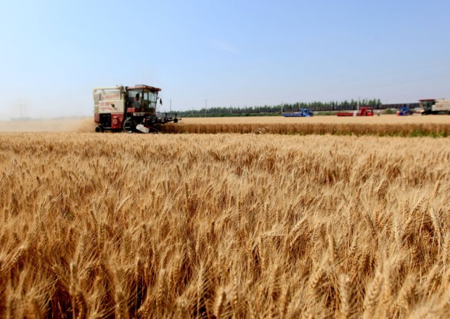 6月12日,在山东省临沂市平邑县绿顺家庭农场,农机手驾驶农机收割小麦。新华社发(武纪全摄)