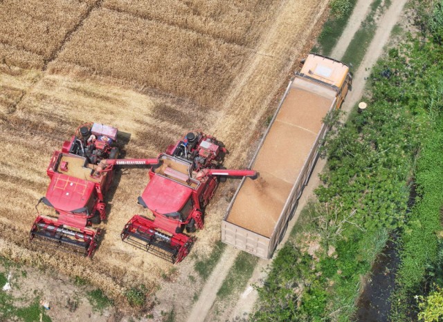 5月28日,在位于江苏盱眙的江苏农垦三河农场,收割机将小麦装车(无人机照片)。新华社记者 季春鹏 摄