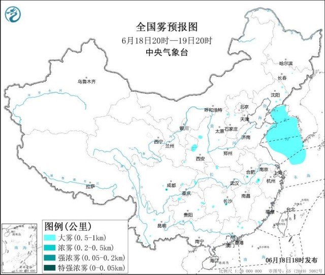 中央气象台6月18日18时发布大雾黄色预警: