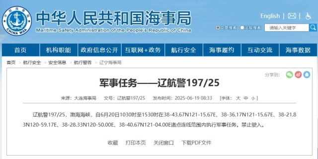央视网消息:据中国海事局网站消息,大连海事局发布航行警告,自6月20日10时30分至15时30分,渤海海峡部分海域执行军事任务,禁止驶入。