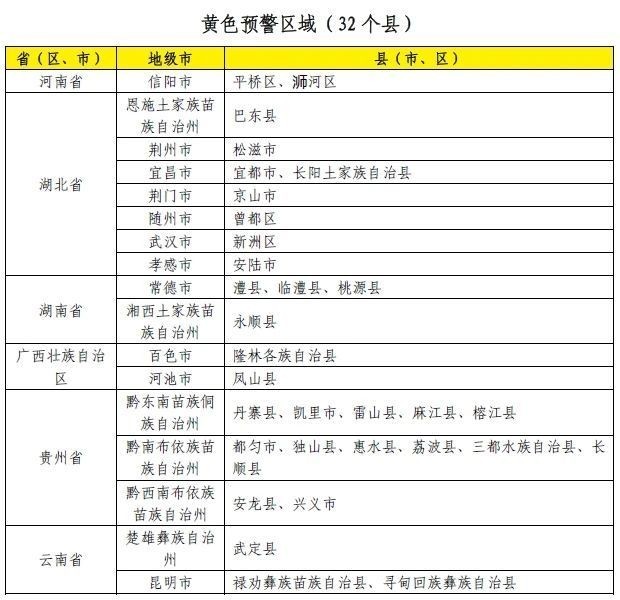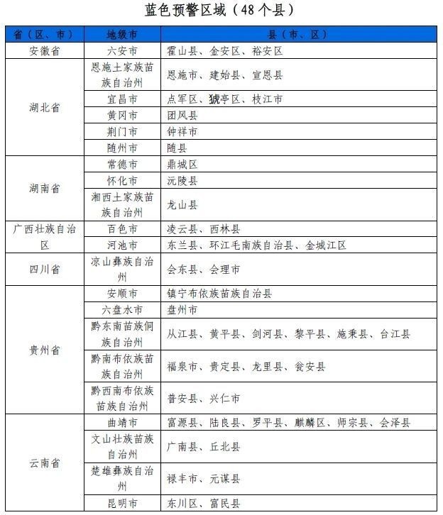 预计,6月19日20时至6月20日20时,安徽西部、河南南部、湖北东部和西南部、湖南北部、广西西北部、贵州南部等地部分地区发生山洪灾害可能性大(橙色预警),局地发生山洪灾害可能性很大(红色预警),预警区域涉及的县(市、区)见下表。其他地区也可能因局地短历时强降水引发山洪灾害,请各地注意做好实时监测、防汛预警和转移避险等防范工作。
