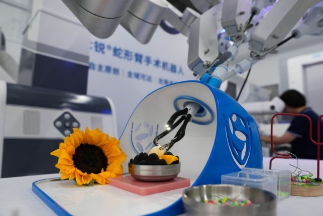 6月18日,工作人员在使用术锐蛇形臂手术机器人进行剥生鹌鹑蛋壳展示。新华社记者郑焕松 摄