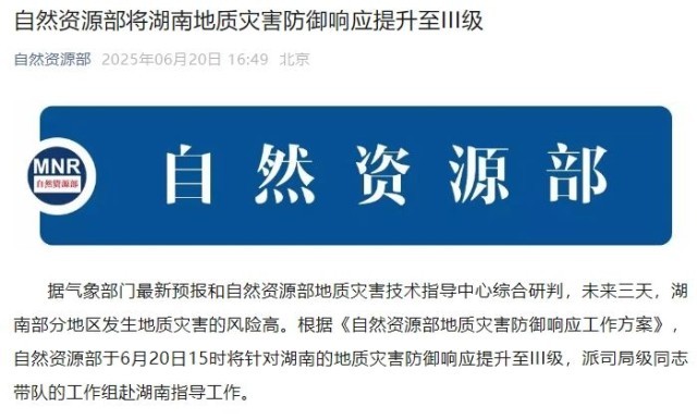 据气象部门最新预报和自然资源部地质灾害技术指导中心综合研判,未来三天,湖南部分地区发生地质灾害的风险高。根据《自然资源部地质灾害防御响应工作方案》,自然资源部于6月20日15时将针对湖南的地质灾害防御响应提升至III级,派司局级同志带队的工作组赴湖南指导工作。