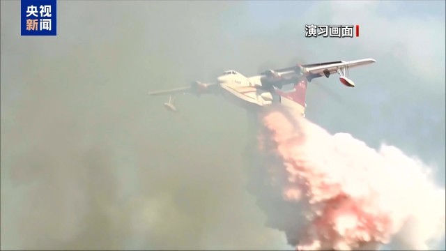 在大兴安岭地区,演练模拟原始林区重特大森林火灾。地面铺设多路管带,向火线输水;“鲲龙”国产灭火大飞机在高空投水,将林火成功扑灭。