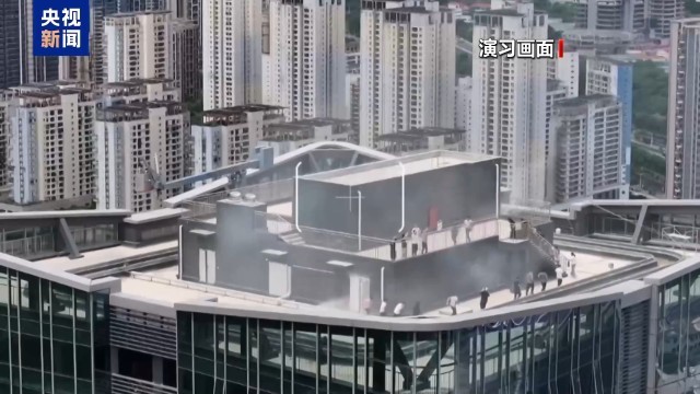 在广东深圳,演习模拟高层建筑突发火灾,人员被困。救援人员在无人机、四足机器人等配合下进入火场,无人机和举高消防车联动扑灭大火,被困人员获救。