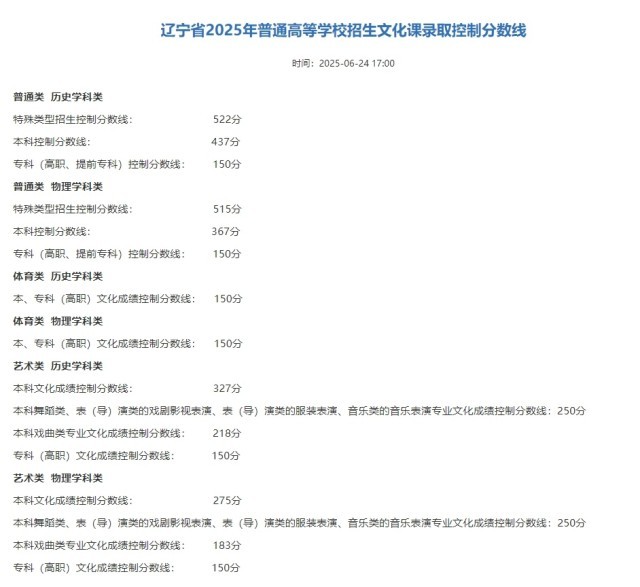 今天(24日),辽宁2025年高考分数线公布,具体如下: