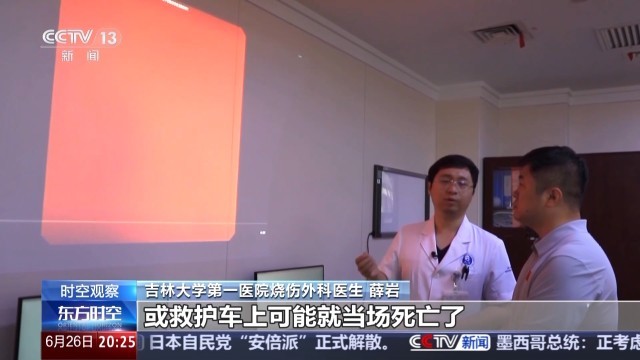 吉林大学第一医院烧伤外科医生 薛岩:爆燃的气体会造成气道黏膜坏死。这种患者,如果不及时处理,很可能没到医院之前,就会造成气道梗阻,呼吸衰竭,可能在送医抢救的道上、救护车上可能就死亡了。