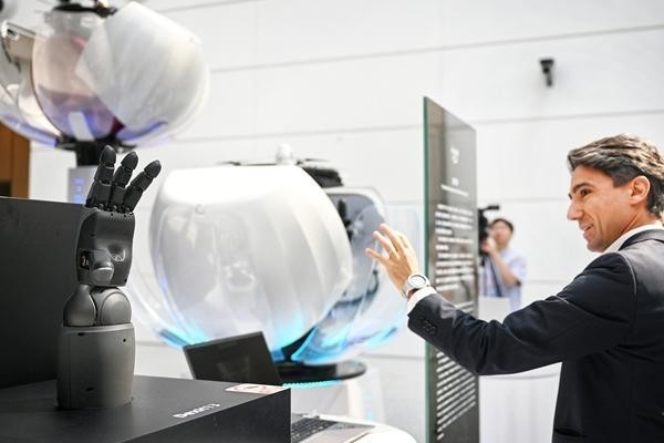 6月24日,天津,参加第十六届夏季达沃斯论坛的嘉宾与全球首款“多维触觉+AI视觉”双模态机器人末端——DexH13仿生灵巧手互动。视觉中国供图