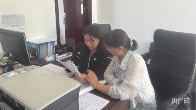 朱一然(左一)帮同事整理材料(央广网发 受访者供图)