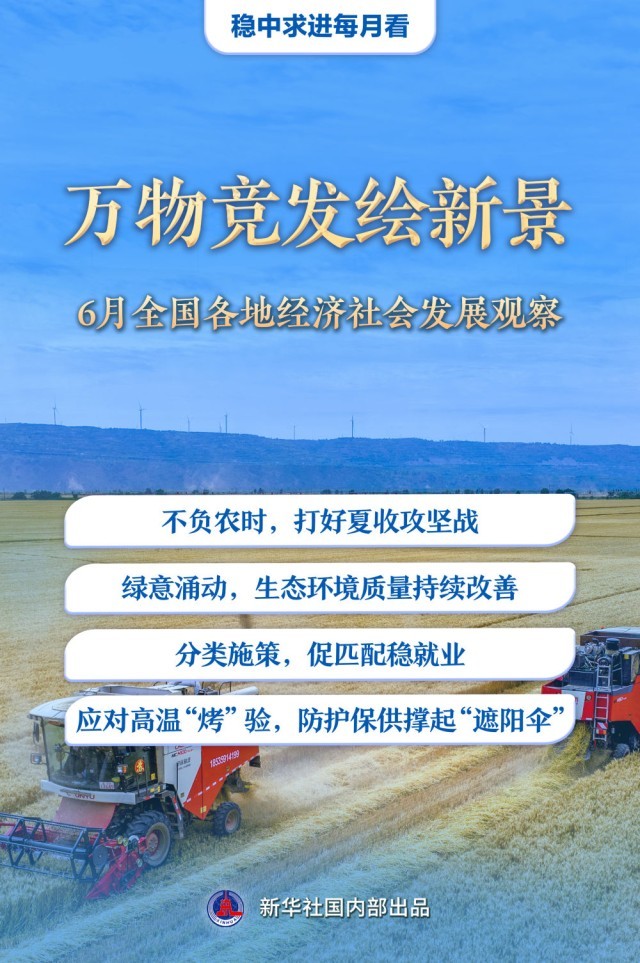6月仲夏,万物丰茂。广袤农田上,“三夏”生产进入关键阶段;绿水青山间,低碳发展不断绘就新图景;全力稳就业,政府、企业与高校同频共振;高温“烤”验下,做好各项保障工作……上半年收官之月,各地各部门统筹推进稳增长、促改革、惠民生举措,推动经济社会沿着高质量发展之路稳步前行。