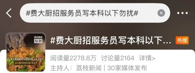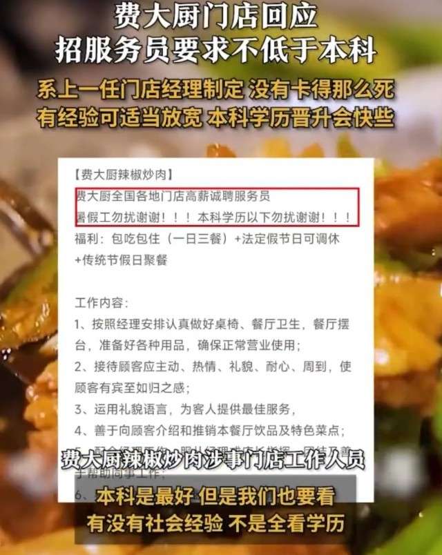 近日,有网友发帖称,费大厨辣椒炒肉深圳一门店招聘服务员,要求“本科学历以下勿扰”。