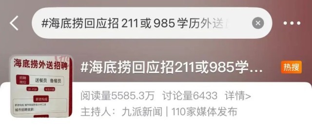 2月,“海底捞招聘985/211高校学历外送员”的消息冲上热搜。据报道,有海底捞门店招聘岗位为“送餐员”和“备餐员”,“普通本科学历”和“985/211及以上”两类员工将享受“大学生专享学历补贴”。