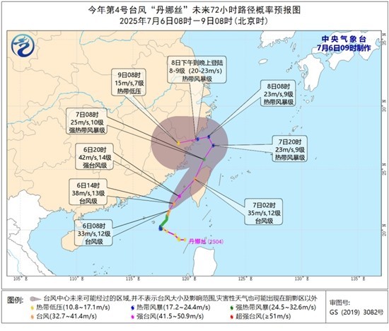 中央气象台预计,“丹娜丝”将继续向东北转北偏东方向移动,强度还将有所加强,7月6日夜间至7日早晨将自南向北穿过台湾海峡,在此期间可能擦过或登陆台湾岛西部一带沿海,7日白天移入东海西南部海面,逐渐向福建北部至浙江中南部一带沿海靠近。