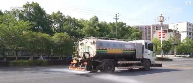 在抚州市临川区,中午最高气温已达38℃,当地环卫部门增派洒水车,加大洒水降温作业频次。