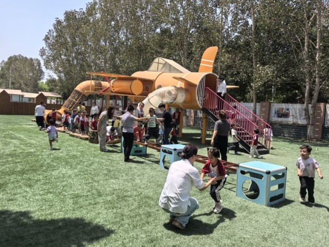 6月24日,在疏勒县第二幼儿园内,东营市援疆老师正带着孩子们进行户外活动。(新华社记者 顾煜 摄)