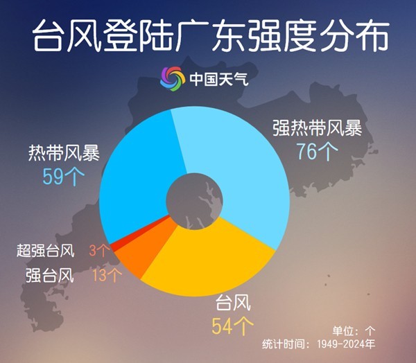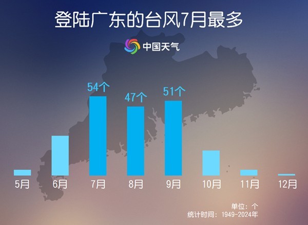 中国天气网统计1949年至2024年台风大数据发现,登陆广东的台风多为直接登陆,而且集中在夏秋季,其中7月最多,达54个。