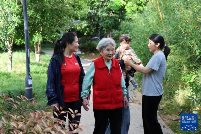 2025年4月18日,官冬香老人(中)与家人在江西省上饶市广丰区的小区里散步。新华社记者 陈璞 摄