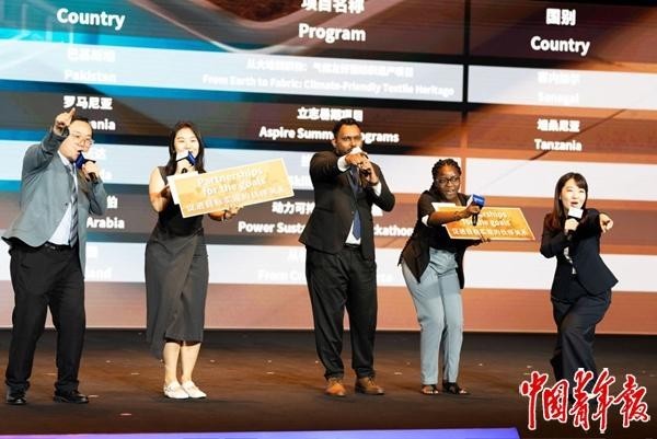 7月15日,2025世界青年发展论坛开幕,参加全球青年发展项目周的各国项目骨干分组登台组队亮相。中青报·中青网记者 李隽辉/摄