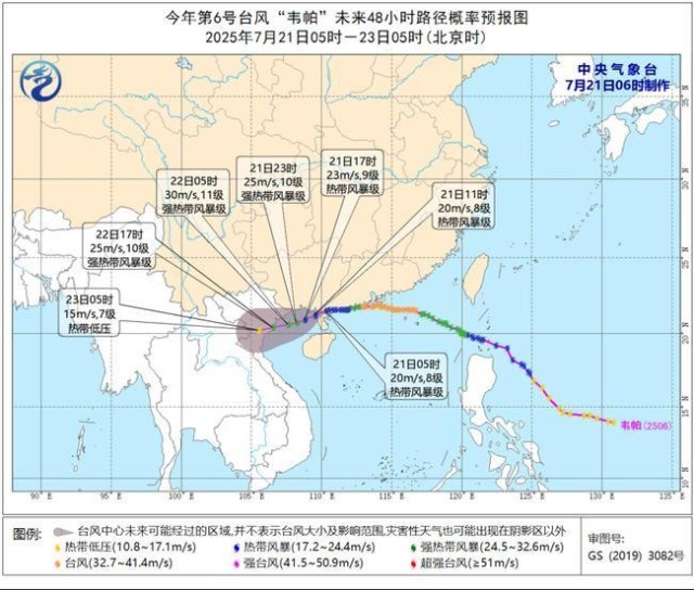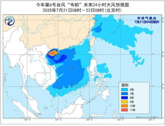 大风预报:7月21日08时至22日08时,受“韦帕”和西南季风的共同影响,东海大部及钓鱼岛附近海域、巴士海峡、台湾海峡南部、南海大部、琼州海峡、东沙群岛、西沙群岛、中沙群岛、南沙群岛以及海南岛沿海、浙江沿海、广东中西部沿海、广西沿海等地将有6~7级风,阵风8~9级,其中北部湾、琼州海峡、广东西部沿海、广西沿海、海南岛沿海的风力可达8~9级,阵风10~11级,北部湾部分海域风力有10~11级,阵风12~13级。